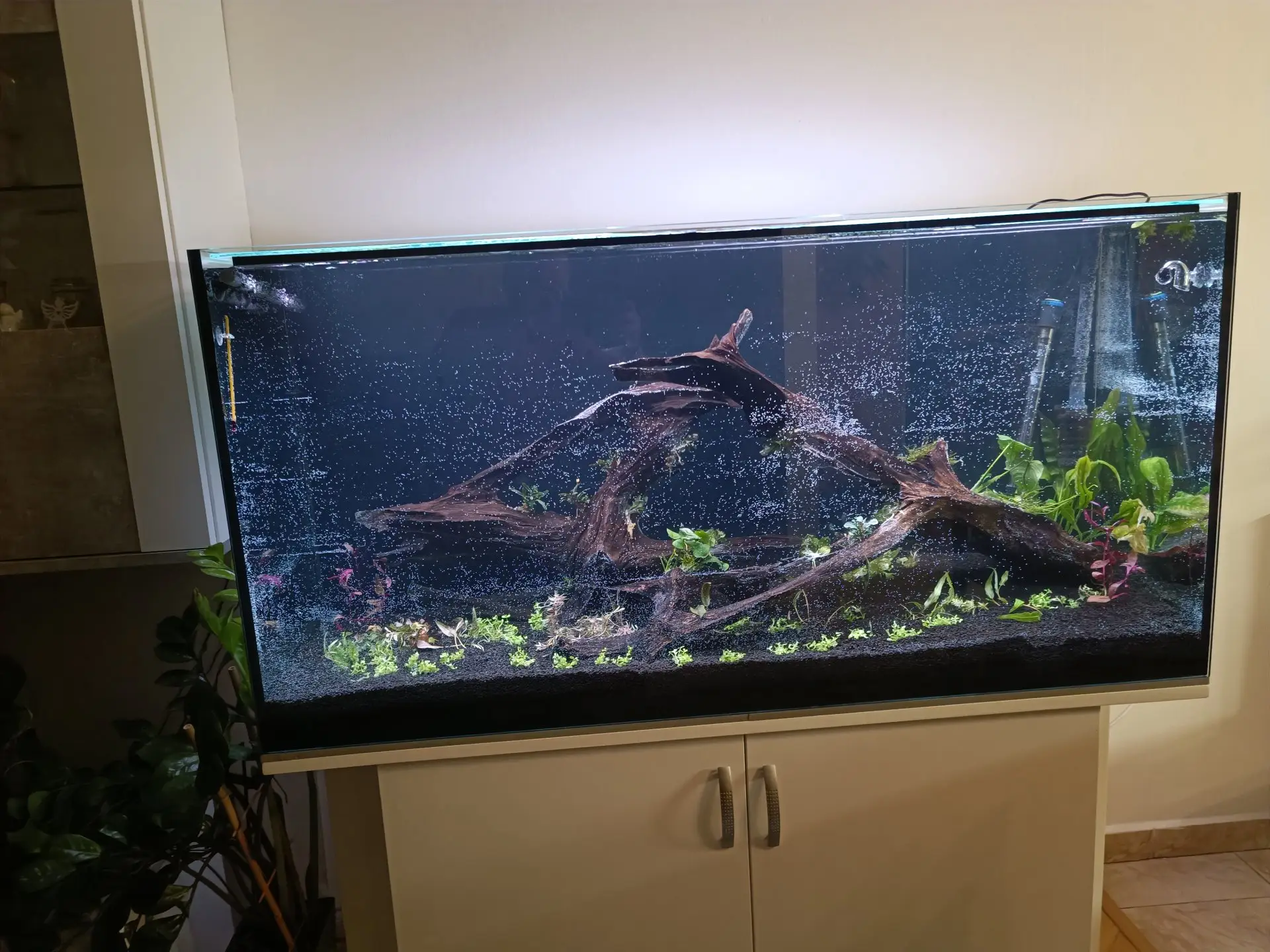 Popis: Bohužel jsem musel udělat nové akvárium, staré mi začalo téct ve spoji silikonu vyteklo 80 litrů do podlahy teď už ale mám nové stolek je původní akorát přetreno na bílo