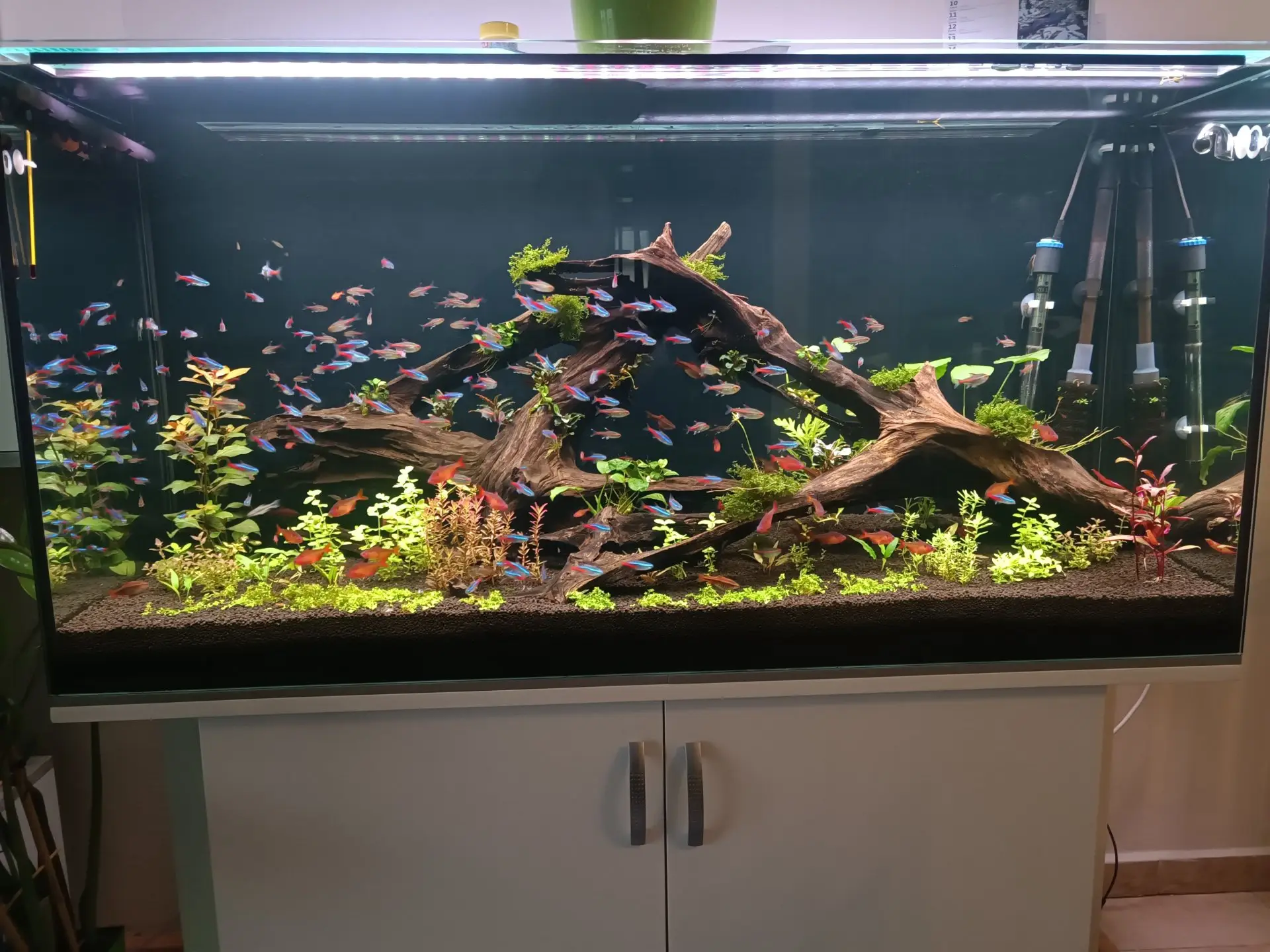 vodním řádu částečně osmotickou vodu Filtraci a topení osvětlení a CO2 jsem už měl z předešlého akvária i kořeny kořeny už mám 18 let. |