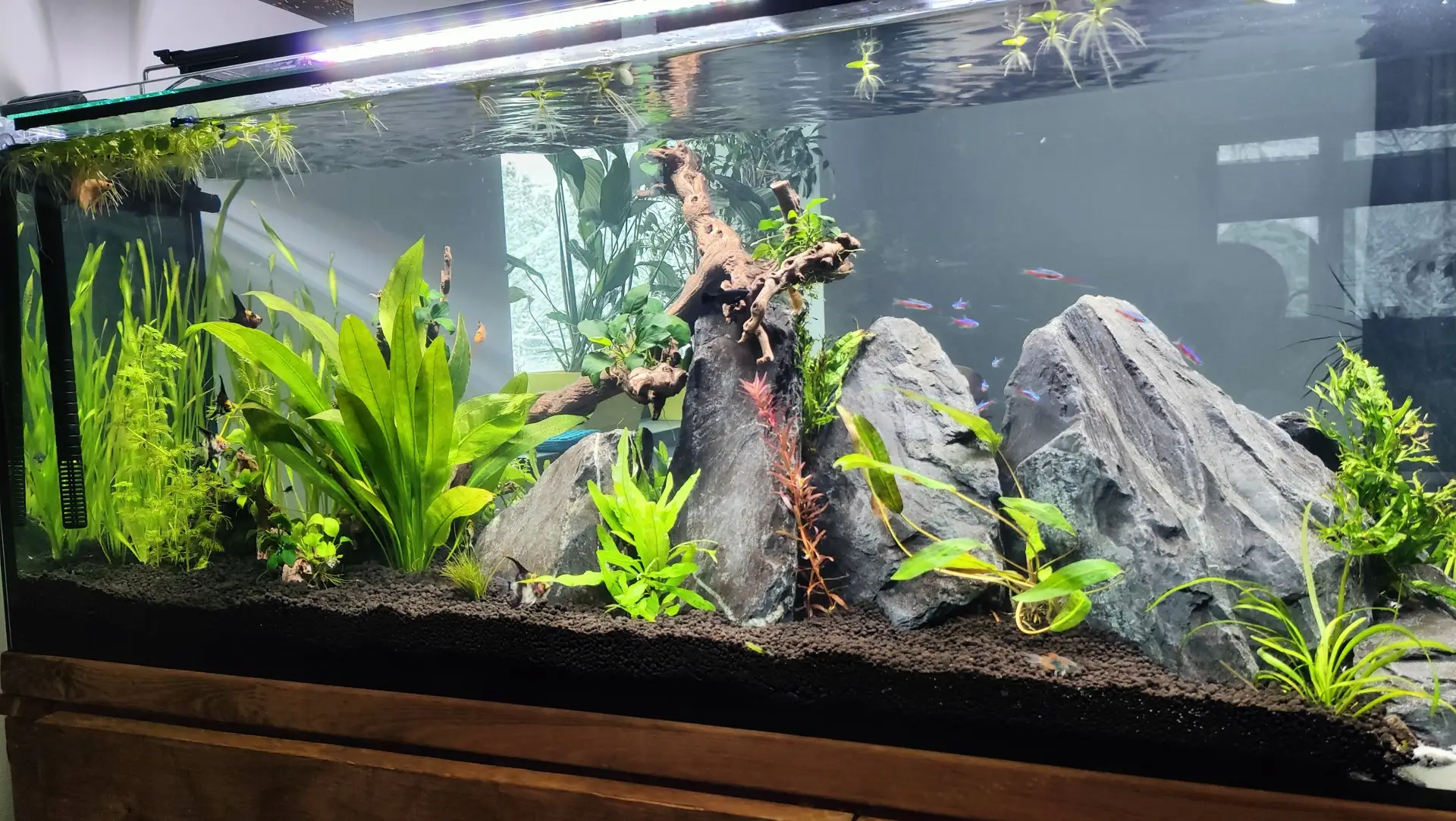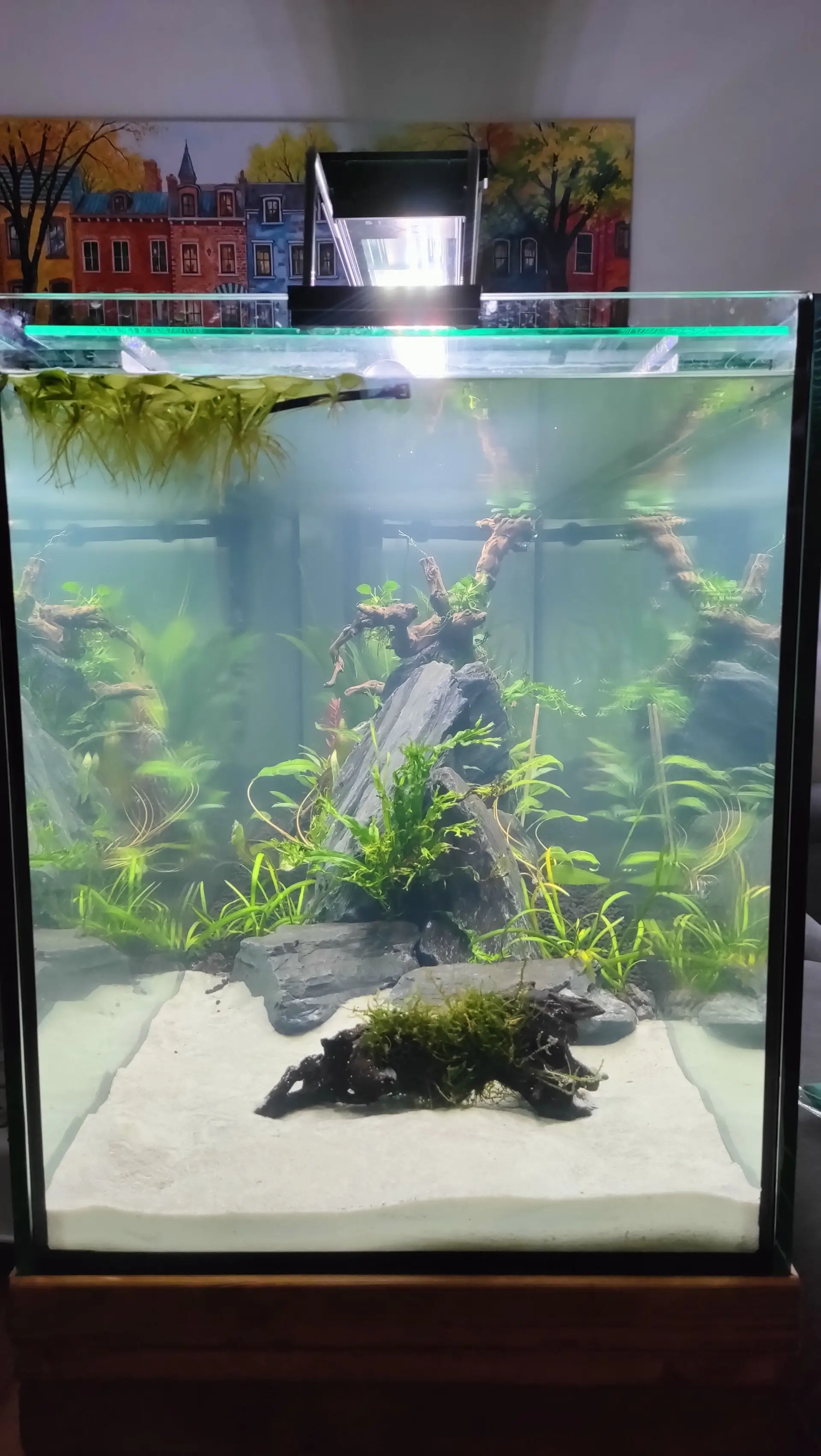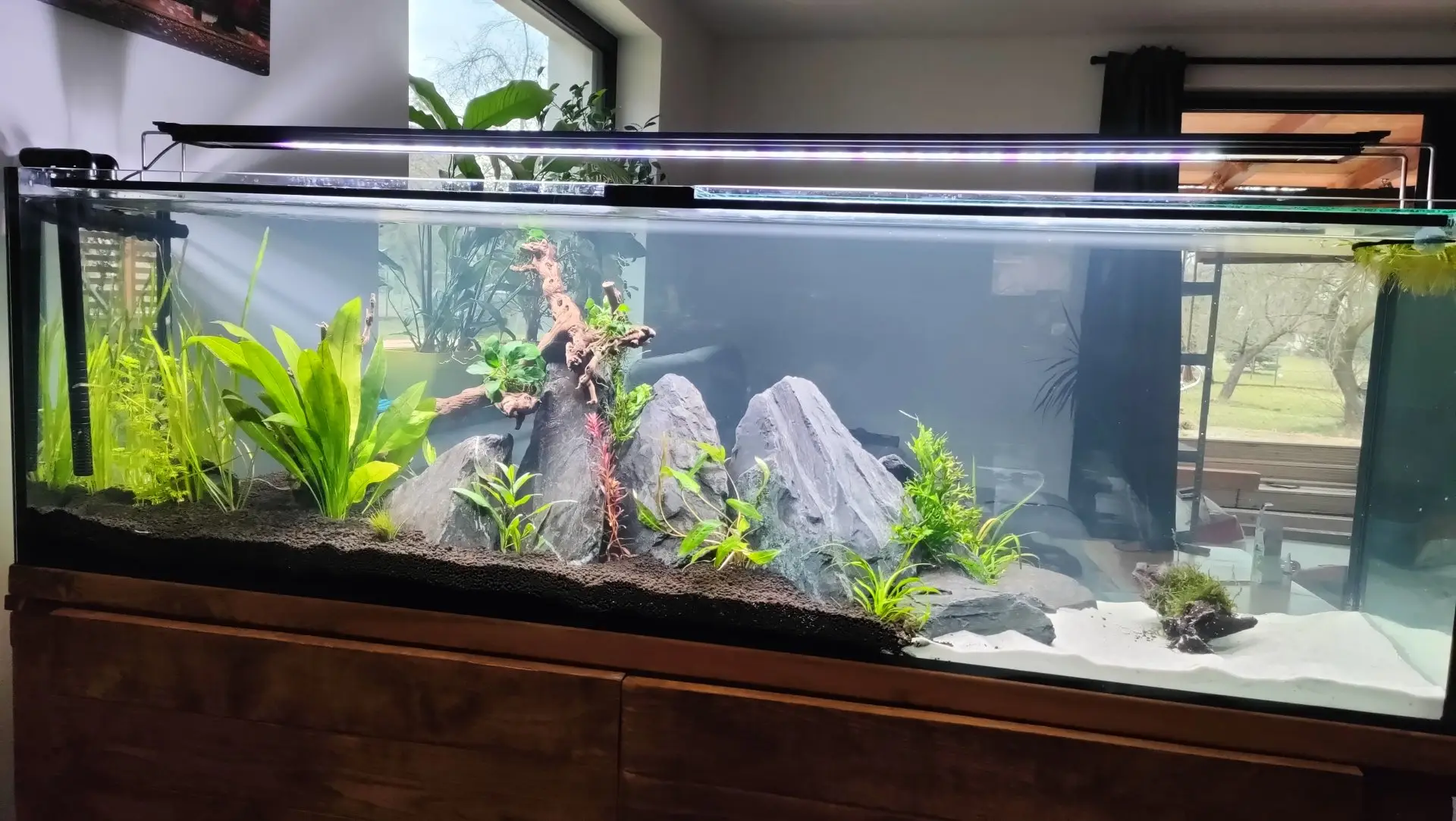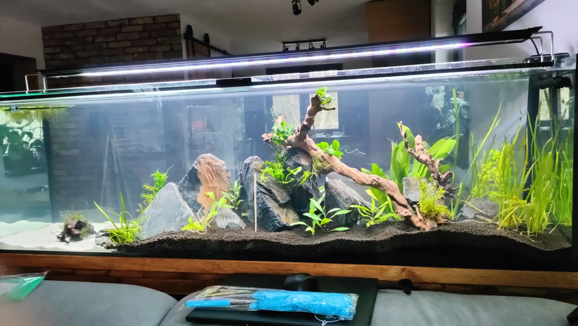 Popis: Rostliny: vallisneria, limnobium spongia, limnophila sessiflora, rotala rotundifolia, microsorum pteropus, hygrophila siamensis, hygrophila guyanensis/nervata, sagittaria subulata, egeria densa, echinodorus bleherae, anubias, cryptocoryne a nejaky mech.
