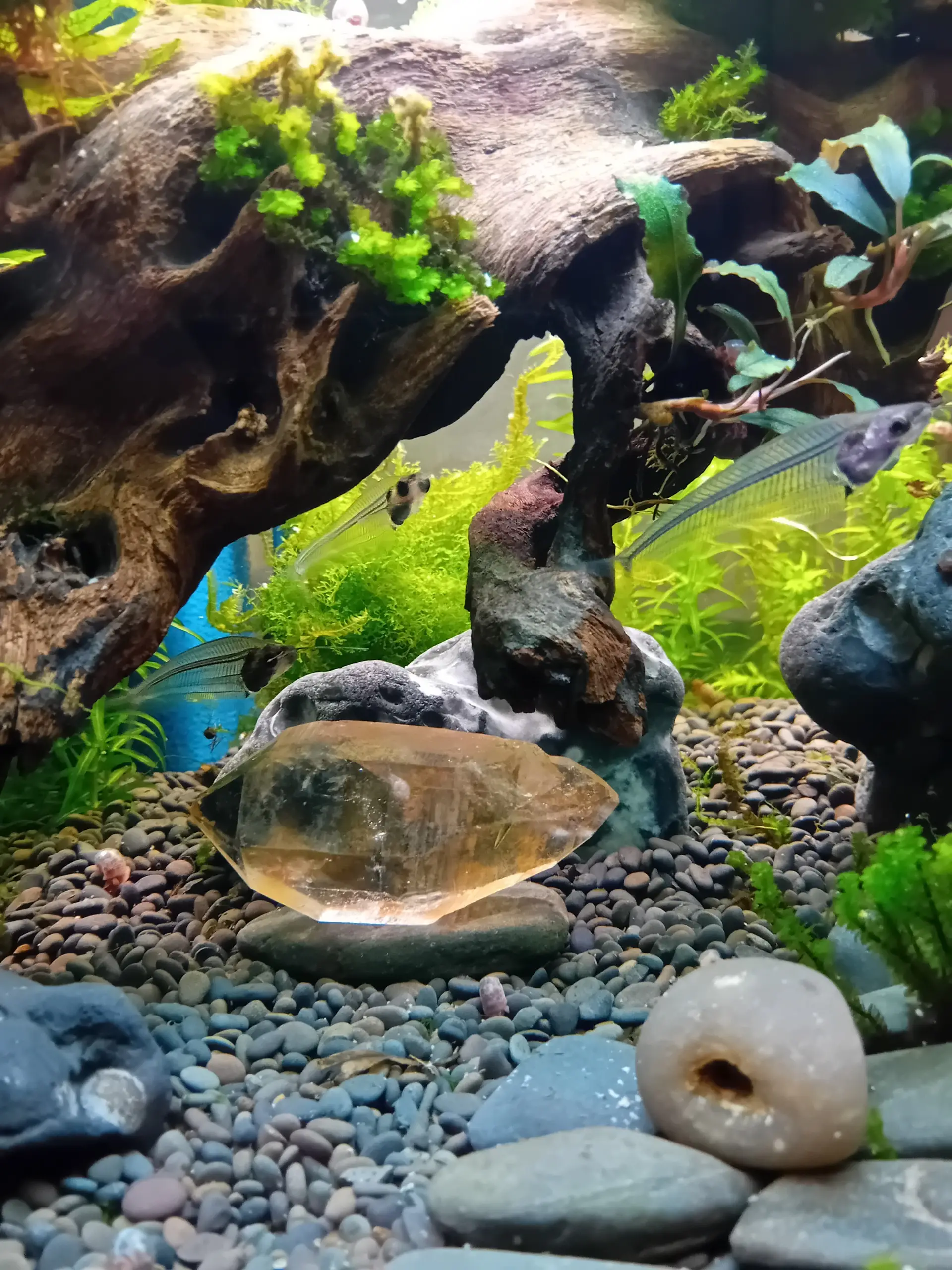 Dekorace: Křišťál z Maroka, kořen, šutry, říční oblázky z říčky Hloučela