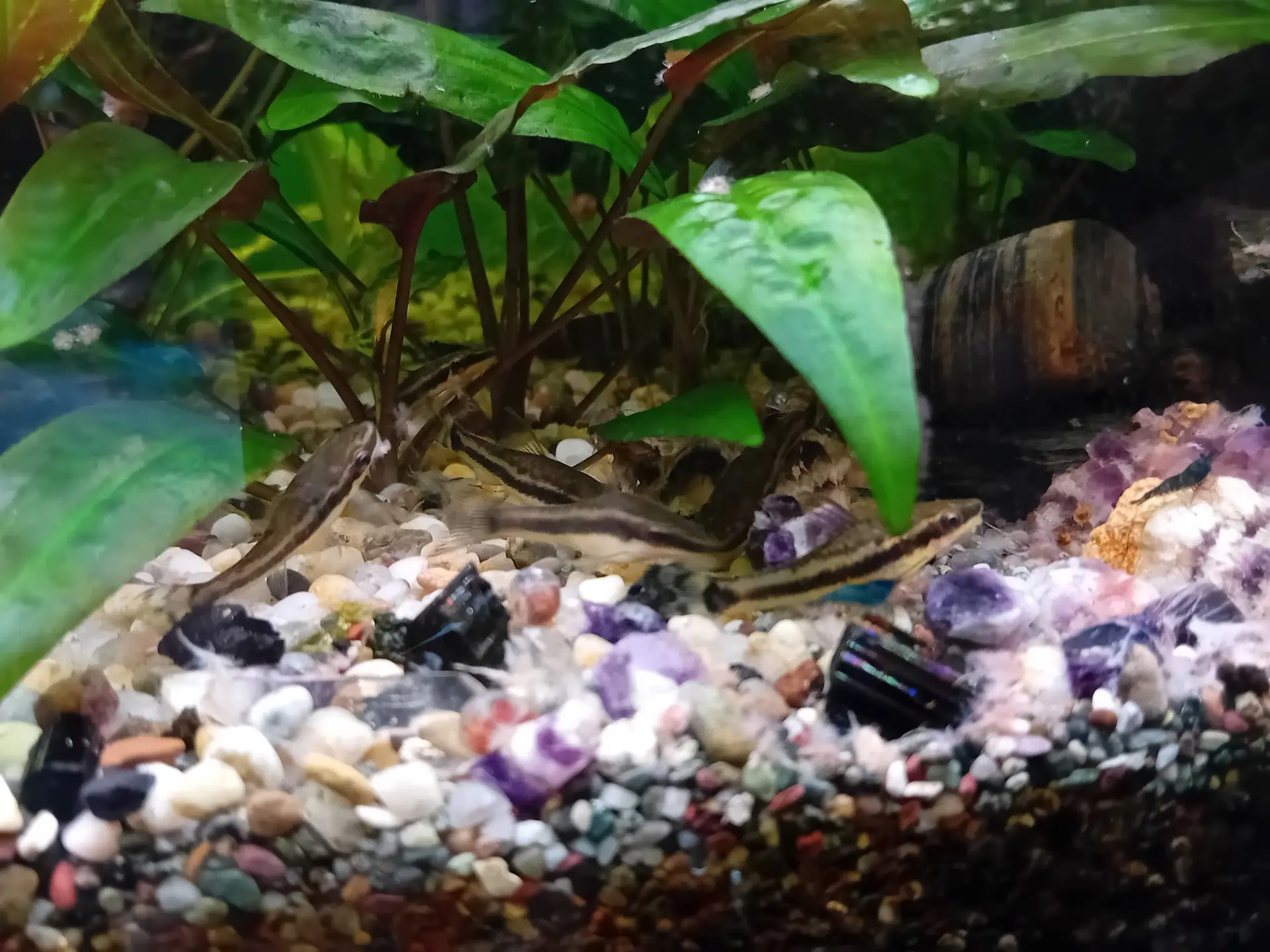 Dekorace: Kořen, pár kamenů, křišťálky, ametysty, turmalíny