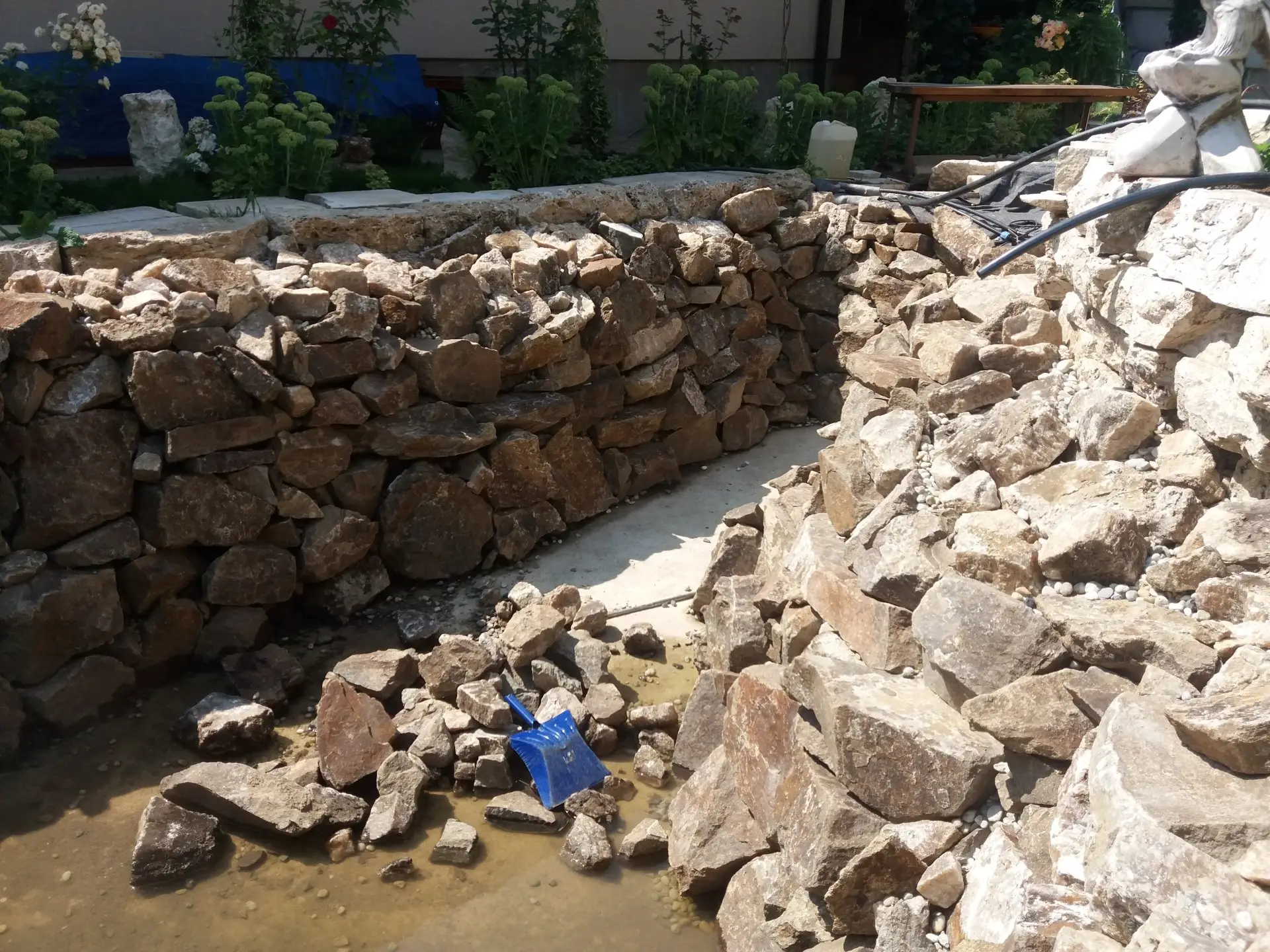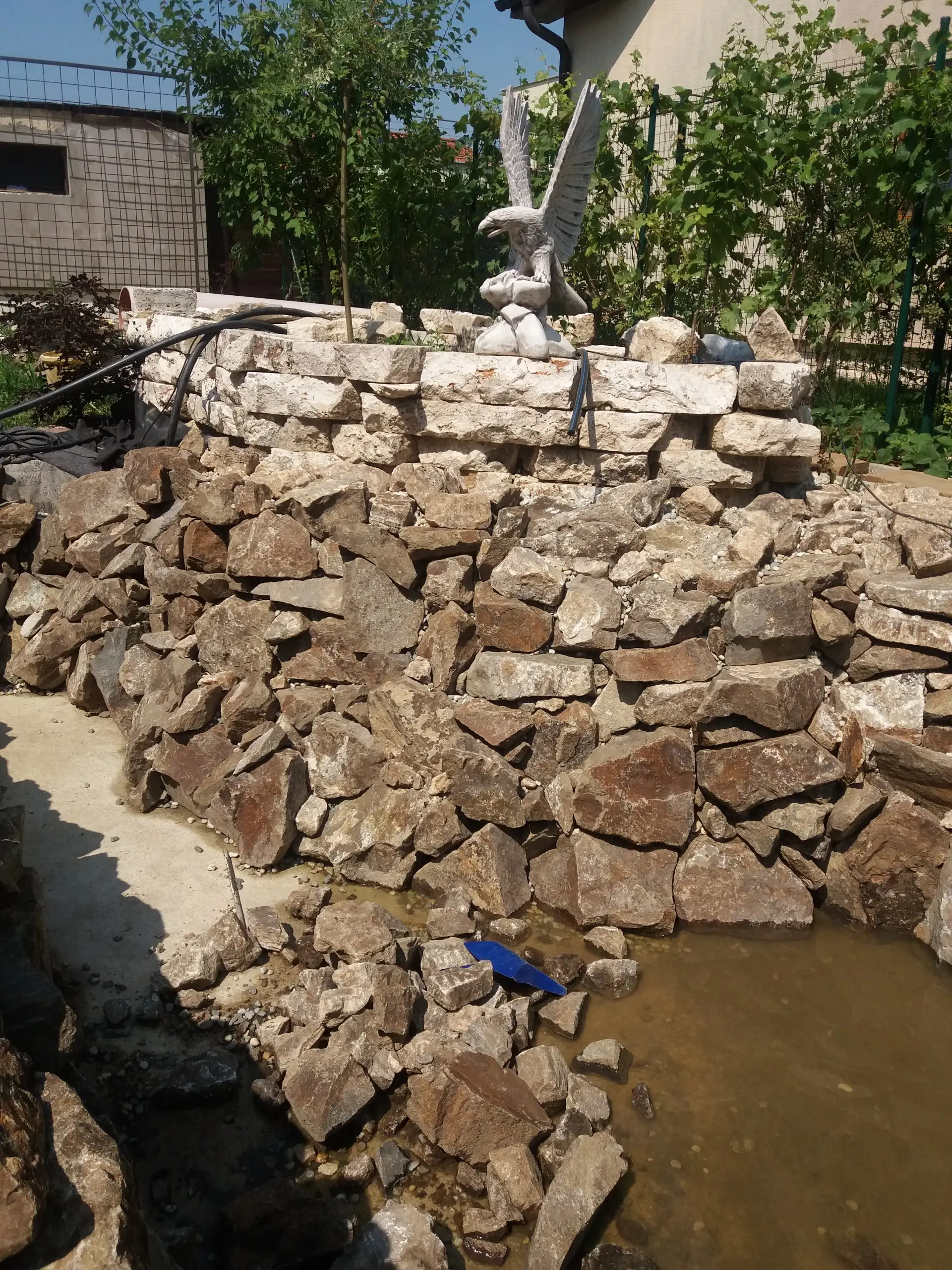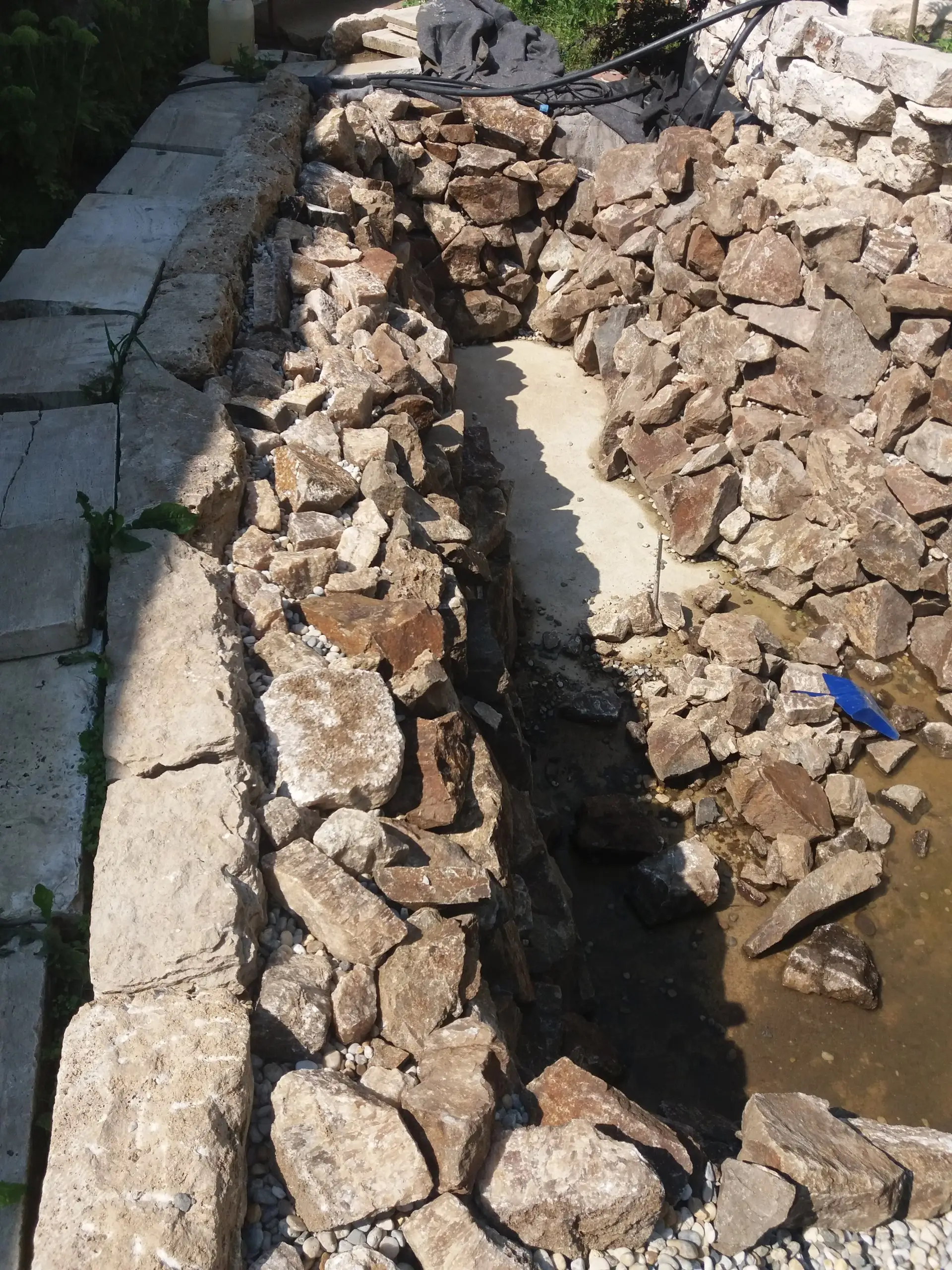 Popis: Jazierko zacalo vznikat v roku 2019.Do vykopanej jamy bola vlozena geotextilia a jazierkova folia 1.5mm. Nasledne dana zelezna vystuz a zabetonovanie dna. Na steny bol pouzity andezit z miestneho kamenolomu ktory bol postupne obetonovany. Travertin som doviezol z miestnej skladky stavebneho odpadu