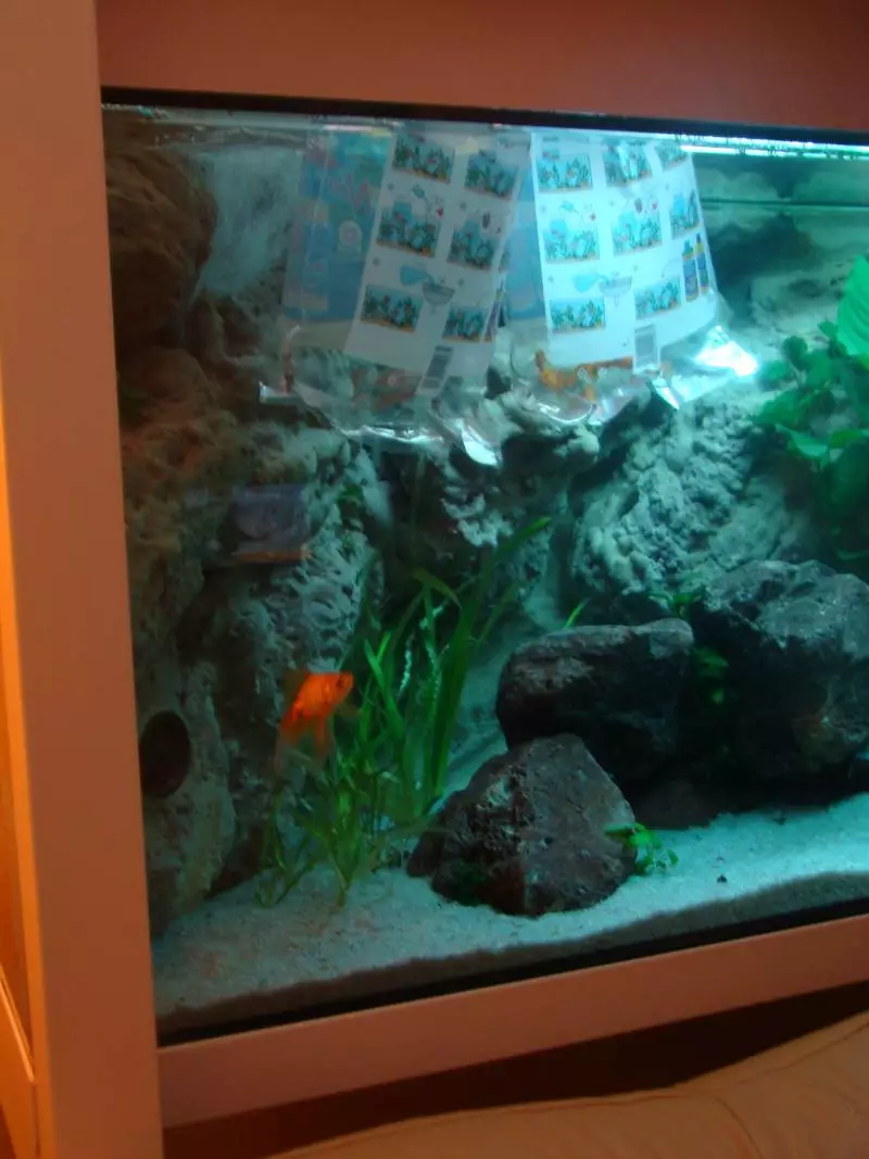 Dekorace: Pár kamenů,pár rostlin(anubias+valisnerie),křemičitý písek a 3D tapeta vlastní výroby.