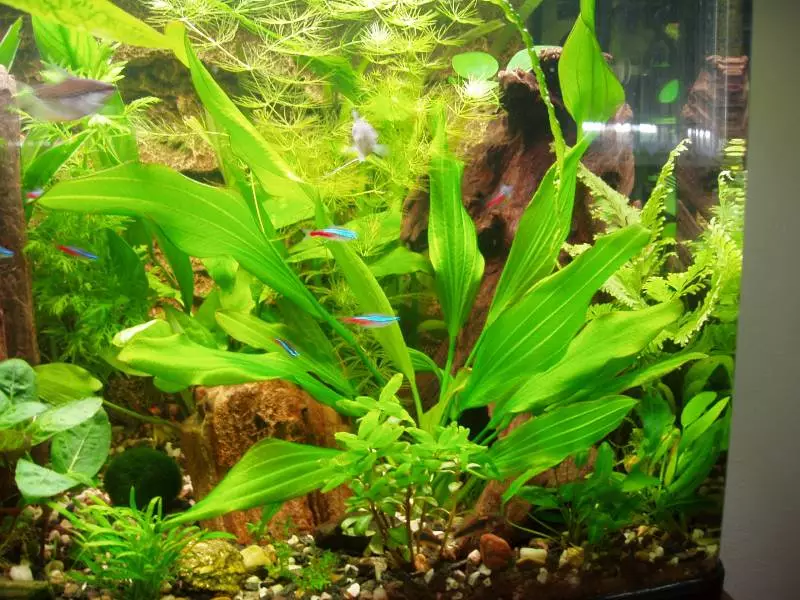 Dekorace: 1x velký kořen, skály ze zkamenělého dřeva, živé rostliny, 3d pozadí