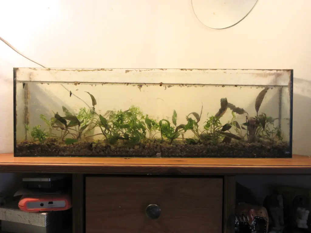 Akvárium nad stolem | Akvárium bylo vyschlé 4 nebo 5 let. Včera jsem v akvaristice koupil Cryptocoryne nurii a založil ho znovu. Ještě jsem přihodil trochu Lomariopsis lineata. |