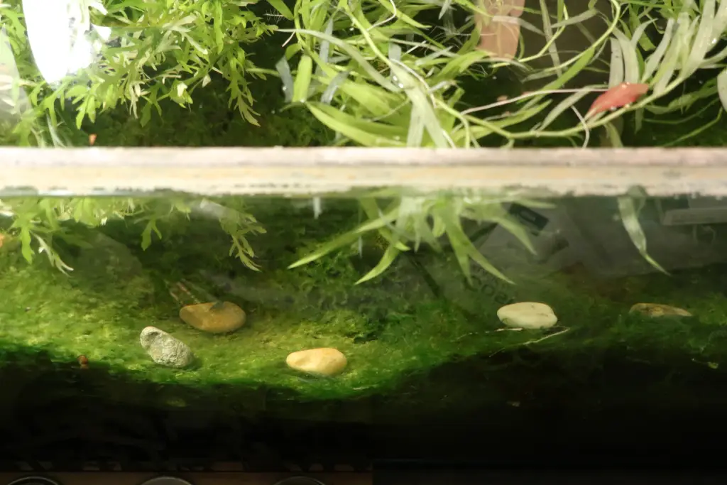Trpaslíci na Modré zátoce | Výměna 48% vody, před výměnou pH 7.8, TDS 217 -> 111 ppm. Redukce cladophory a sinice. Čtyři čtverzubci viděni pohromadě. |