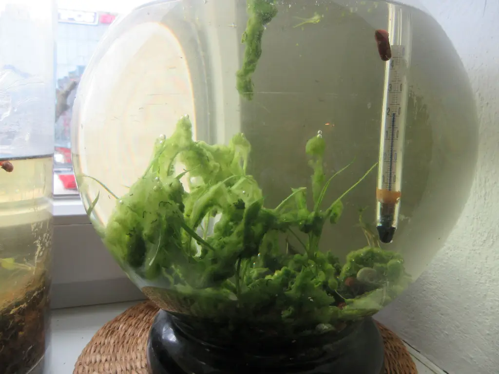 Koule na severním okně IV. | Ryby bohužel uhynuly už před lety. Kryptokoryny pokryla zajímavá řasa. Sklo je čisté, protože v tom přežil military helmet. Nenechal jsem to úplně vyschnout, takže se to dá oživit. Před týdnem jsem tam hodil jednu formosku, kterou potřeboval odložit Tomáš Mizerák. Dnes jsem donesl hrst okružáků od Dodyho Benkovského. Jsem zvědavý, jestli na tu řasu budou stačit (mohl bych ji částečně omezit ručně, ale chci udělat experiment). |