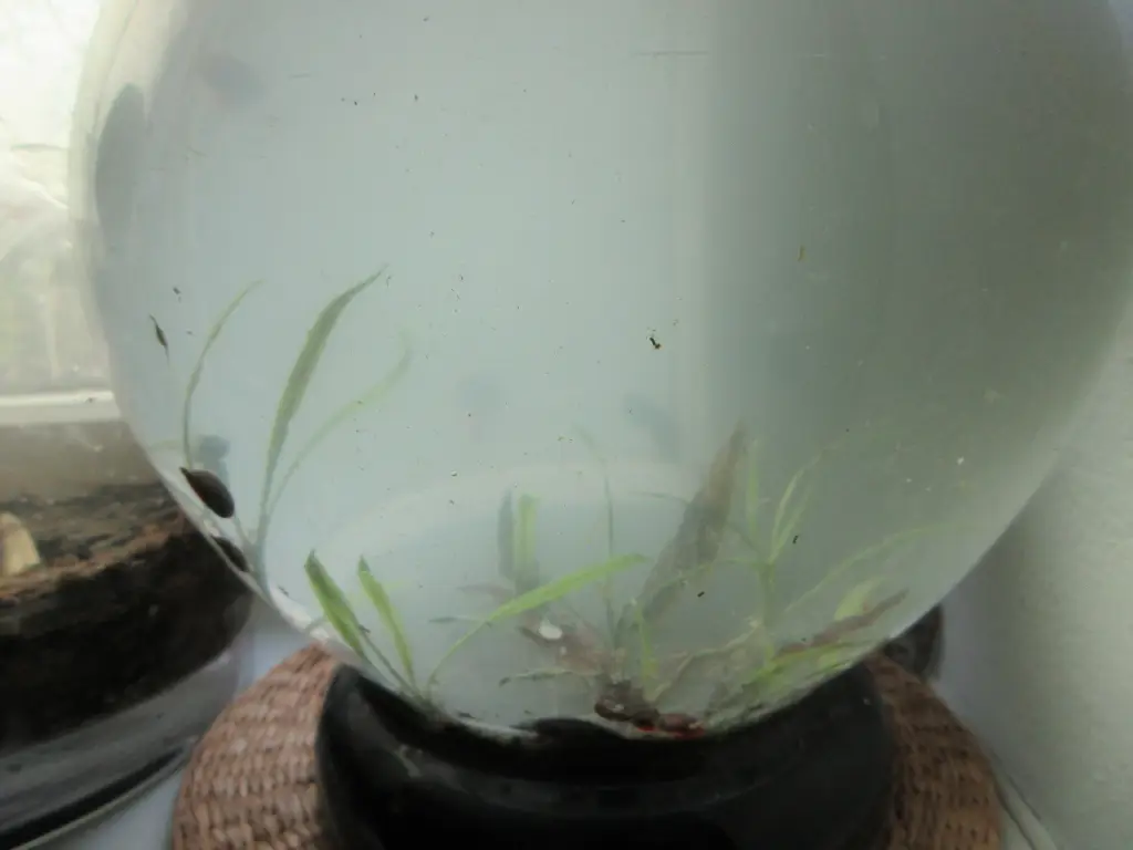 Koule na severním okně IV. | Okružáci dostali řasy z rostlin, ale spíš fyzickým pohybem, než konzumací. Na dně jsem našel asi třícentimetrovou, hutnou, kluzkou vrstvu řas, kterou jsem včera mechanicky podebíral, odstraňoval a odkaloval. Docela brutální zásah, po kterém se stále voda ne úplně vyčistila. Taky jsem sem umístnil dvě Cryptocoryne wendtii 'Florida Sunset', které jsem v sobotu získal od Vl Ca. |