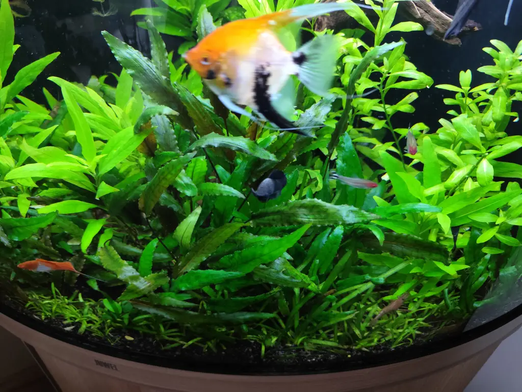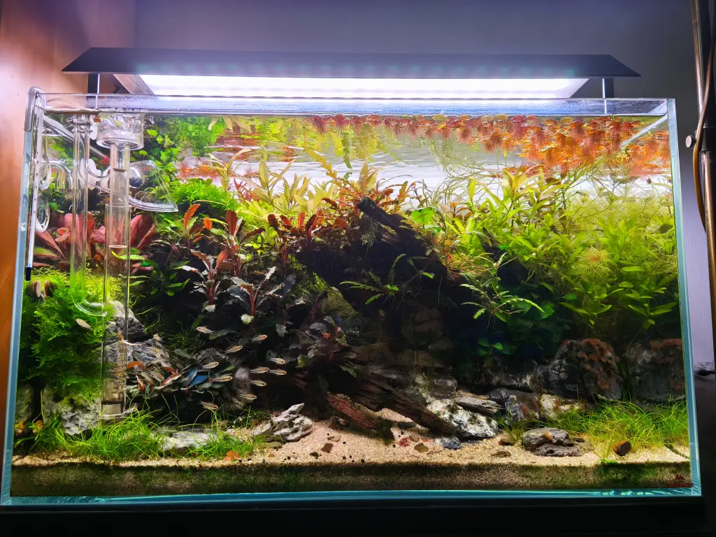 Ložnicový antistres | Z údržby - úklid hladiny - úklid vláknité řasy - probírka Ceratophyllum - přesazení Ludwigie repens a Hydrocotyle leucocephala - protože jsem akvárium zaprasila, umístila jsem filtr, aby se voda rychleji pročistila, zvážím zda bude dočasně nebo na delší dobu - očista předního skla do řas, očista krycího skla octem - výměna vody a aplikace tekutého hnojiva |