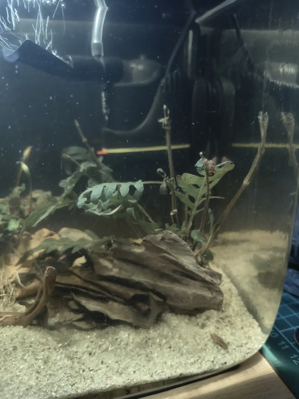Trpaslíci na Modré zátoce | Dvacátý druhý den od založení výměna poloviny vody. TDS po čtyřech dnech od výměny 234 ppm. Rostlinám se daří. Dokonce začala kvést i muteň na hladině. Bucephalandry na dřevě vyhnaly nové kořeny a pomalu nasazují i nové listy. Hottonie už je zase u hladiny, ale dnes jsem jí nezkracoval. Misto toho jsem zastřihl mokřanku, která už byla u hladiny taky, a pinnatifidu, kterou musím držet hodně zkrátka. Záměrem je docílit zahuštění a zmenšení listů, které by měly pokrývat celou pravou stranu dřeva. Hnojím každé ráno cca 0,4 ml Invital Macro, 0,4 ml Kali a 0,6 ml Feroxu. Dnes zahlédnuti dva menší pancéřníčci a tři krevetky. |