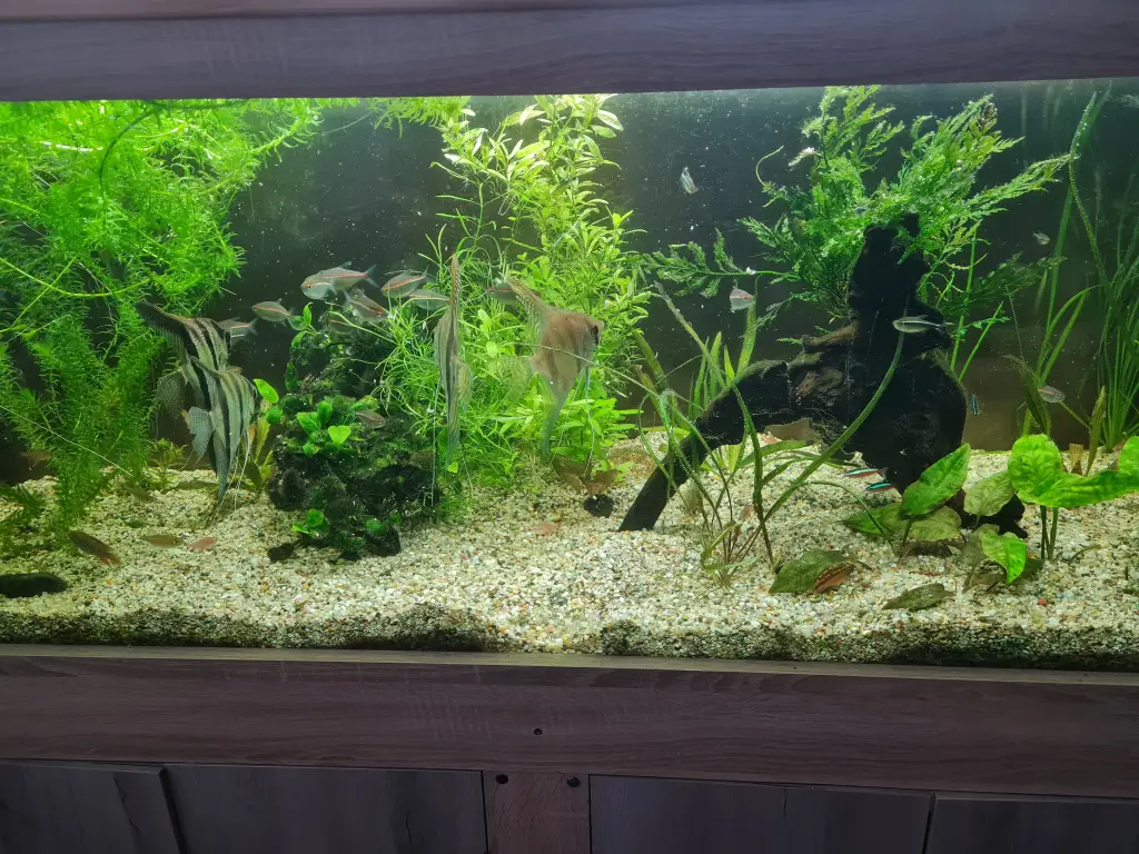 *Johnyho a V mini* | Výmena polovice vody, očista skiel. Pridané tekuté hnojivo a baktérie. Riasa ktorú som nevedel identifikovať nakoniec nieje riasa ale nejaký povlak, ktorý sa vytvára na novom dreve, takže to celé dáva význam. |