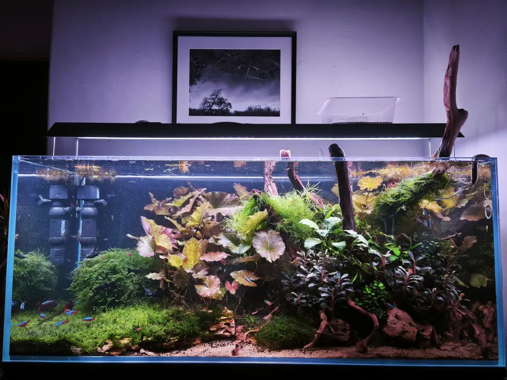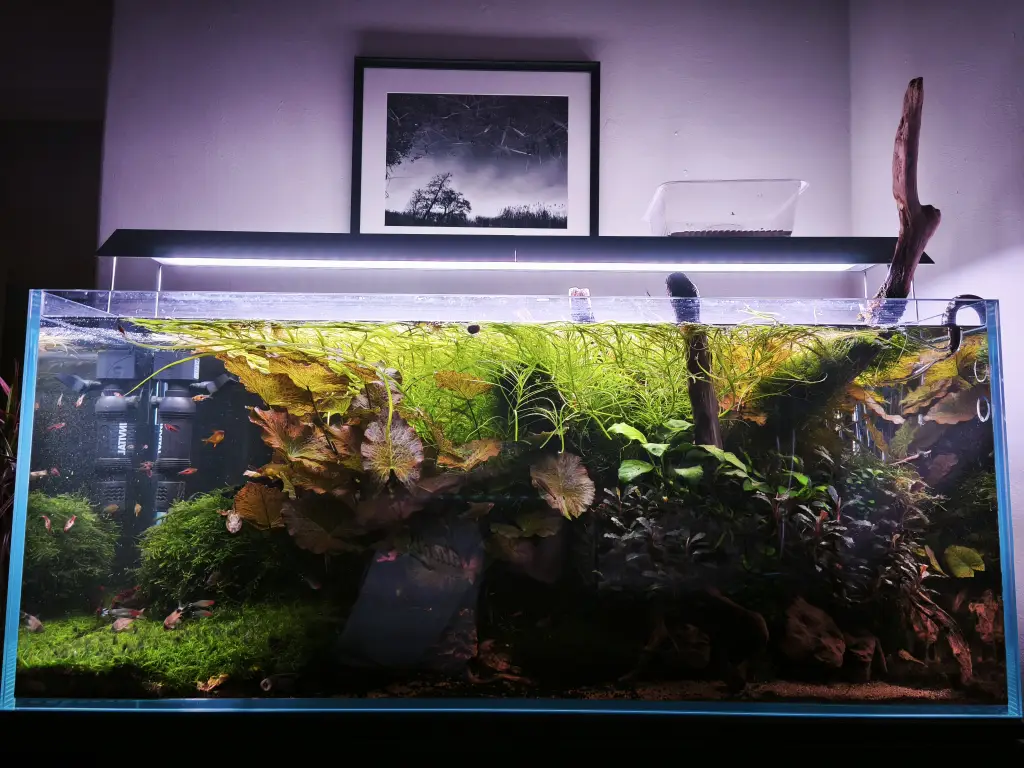 Dutch style 90p | 14 měsíců . Porad je to kam posouvat. Světlo ted jedu naplno 72w. Na krajích jde vidět ze to roste trochu hůř, chtelo by to delší světlo. Založil jsem si do 60p emerzarium, tak můžu dávat prostřihy tam, takže se snad uvolní trošku místa pro nové druhy v 90p. |