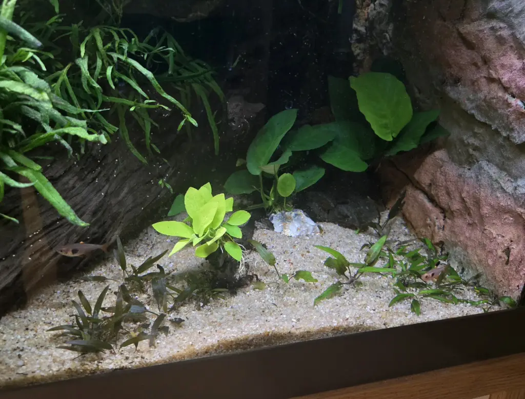 Trpaslíci na Modré zátoce | Pravidelná úterní údržba. Zkrácení rostlin, vysbírávání řasy a výměna poloviny vody. Před výměnou TDS 201, po výměně 101 ppm. Do zadní části jsem zapichal několik stonků rychlerostoucího pogostemonu octopus. |