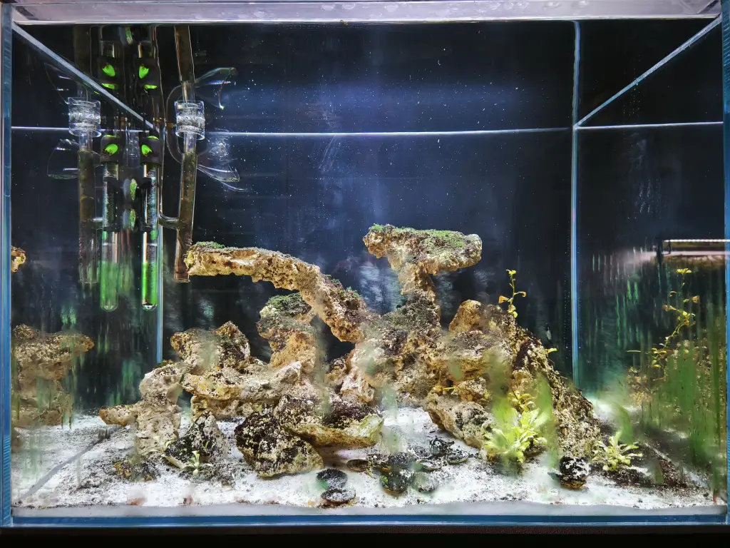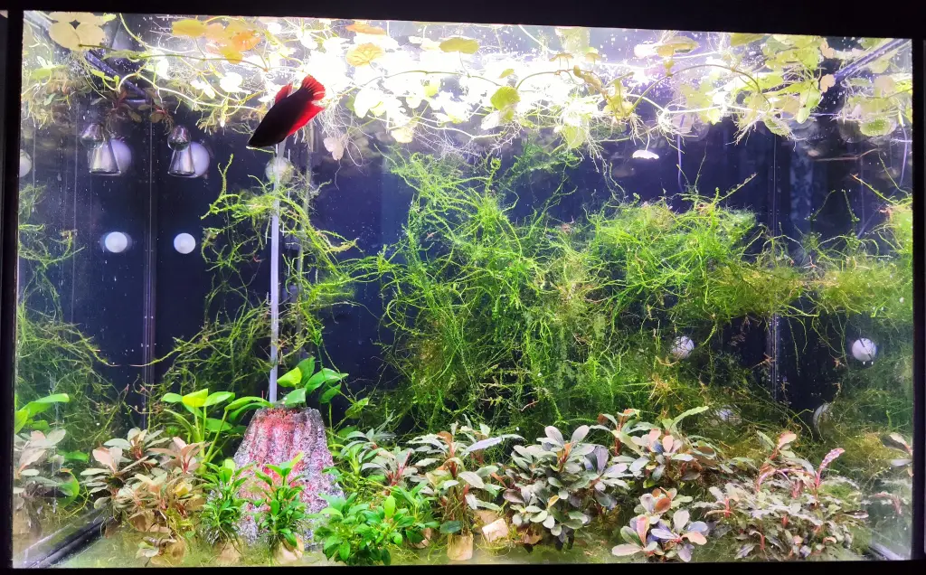 Poslední měsíc a půl jsem toto akvárium probíral k životu - nejprv postupně doléval vodu (polovina jí byla pryč), postupně vybíral řasy z hladiny, až na hladině žádná není.