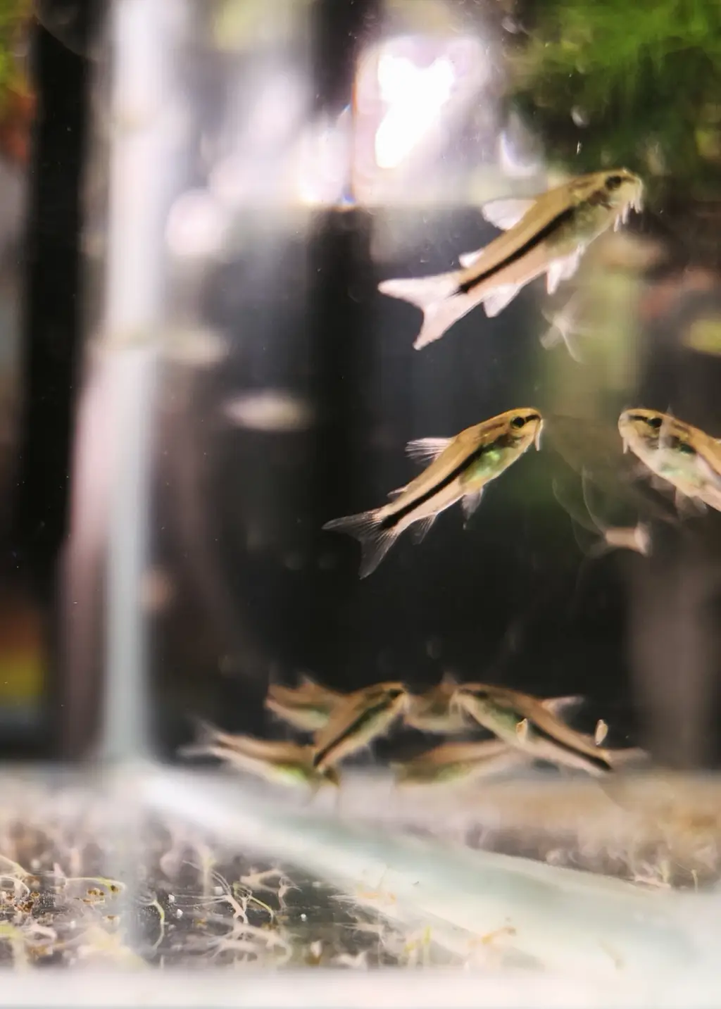 Já akvárium III. | Tak mám tedy 13 nových podnájemníků. (Rájovců dlouhopliutvých).Dva největší z odchovu šli rovnou do 138 k rodičům (a strýcům a tetkám).Na uvítanou dostali rozmražené mšice z letních zásob. |