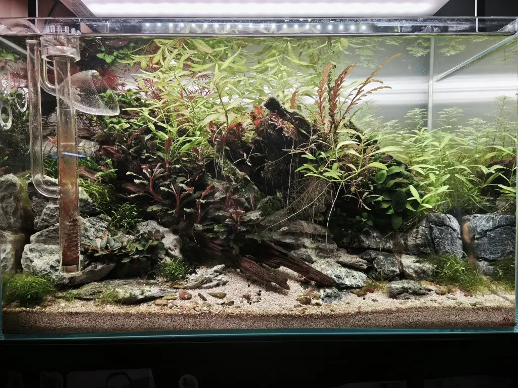 Tichá louže | Před necelými třemi měsíci znovu založení. Rostliny i dekorace zůstaly. Přibyly jen kameny dragon stone a pár rostlin. S pokorou se vracím k drobným rybám. Rájovci vyžrali vše živé a rostlinám to vůbec neprospívalo. Delší dobu jsem chtěl vyměnit štěrk za jemnější. Momentálně mám frakci 0,8-1,5mm. Nádrž stále funguje bez filtrace a topení. |