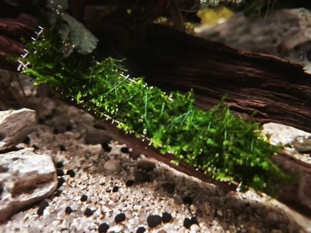 Trpaslíci na Modré zátoce | V rámci výměny vody jsem zlikvidoval jeden velký chomáč řasy, který býval trsem parvy a nahradil ho čerstvou vzrostlejší parvou vyškubnutou ve Vertical limitu. Na spodní část padlého dřeva jsem zkušebně přišpendlil kus nerez mřížky s nastříhaným vánočním mechem (vesicularia montagnei) |