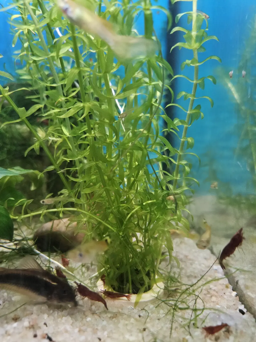 Krevetárko za dobré vysvědčení | odkalení malým zvonem, prostřih a rozesazení "chobotnice" (plus ještě jsem odebrala pro kolegyni celou zavařovačku a nevypadá že ubylo), odstranění torz ludwigie (té nestačilo ani umístění přesně pod lampičkou) a hottonie (tu se úspěšně snažila převálcovat mokřanka). Ještě uvidím jak se bude dařit bakopě, ale už se rýsuje další akvárko tak asi půjde tam. |